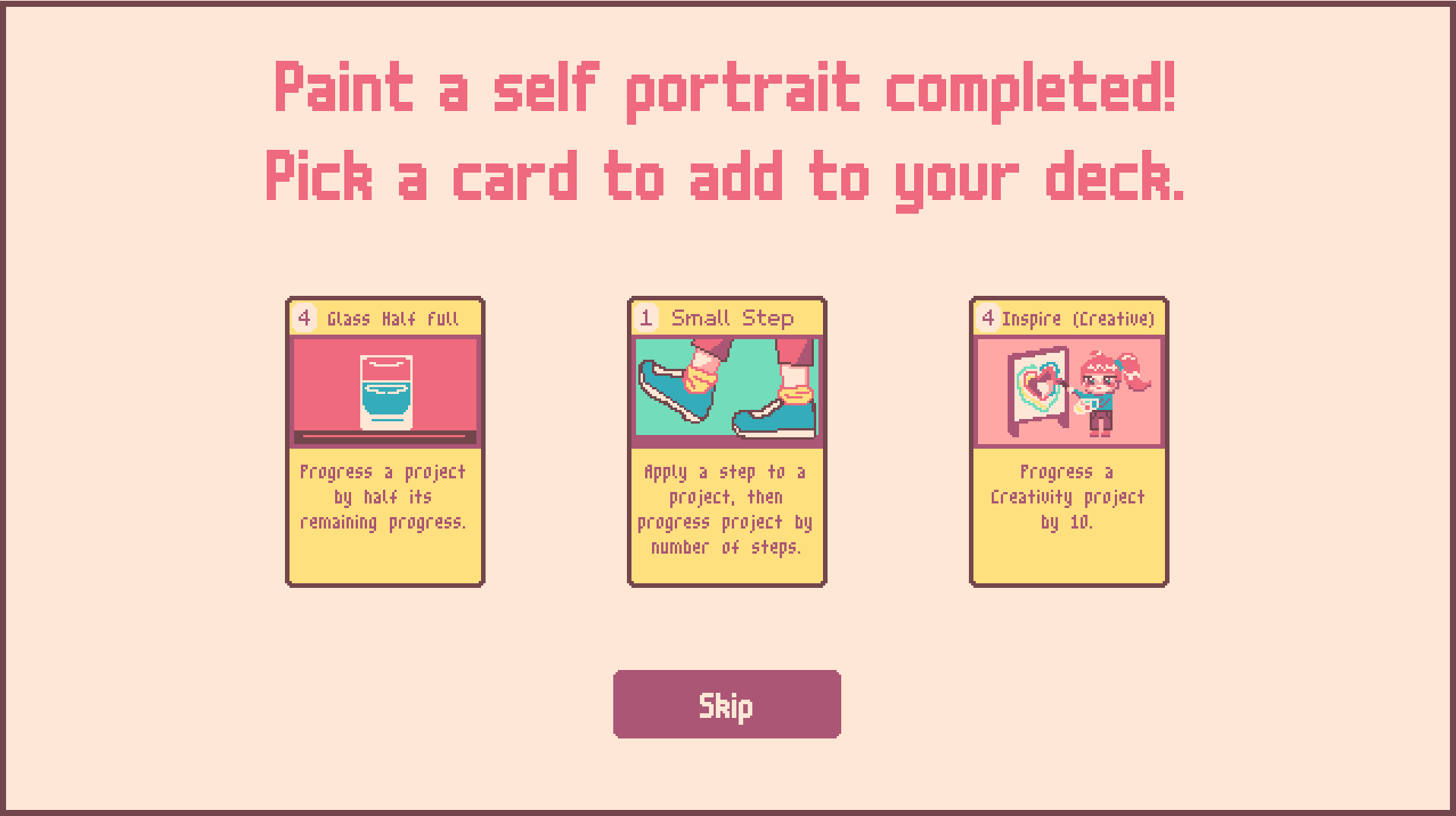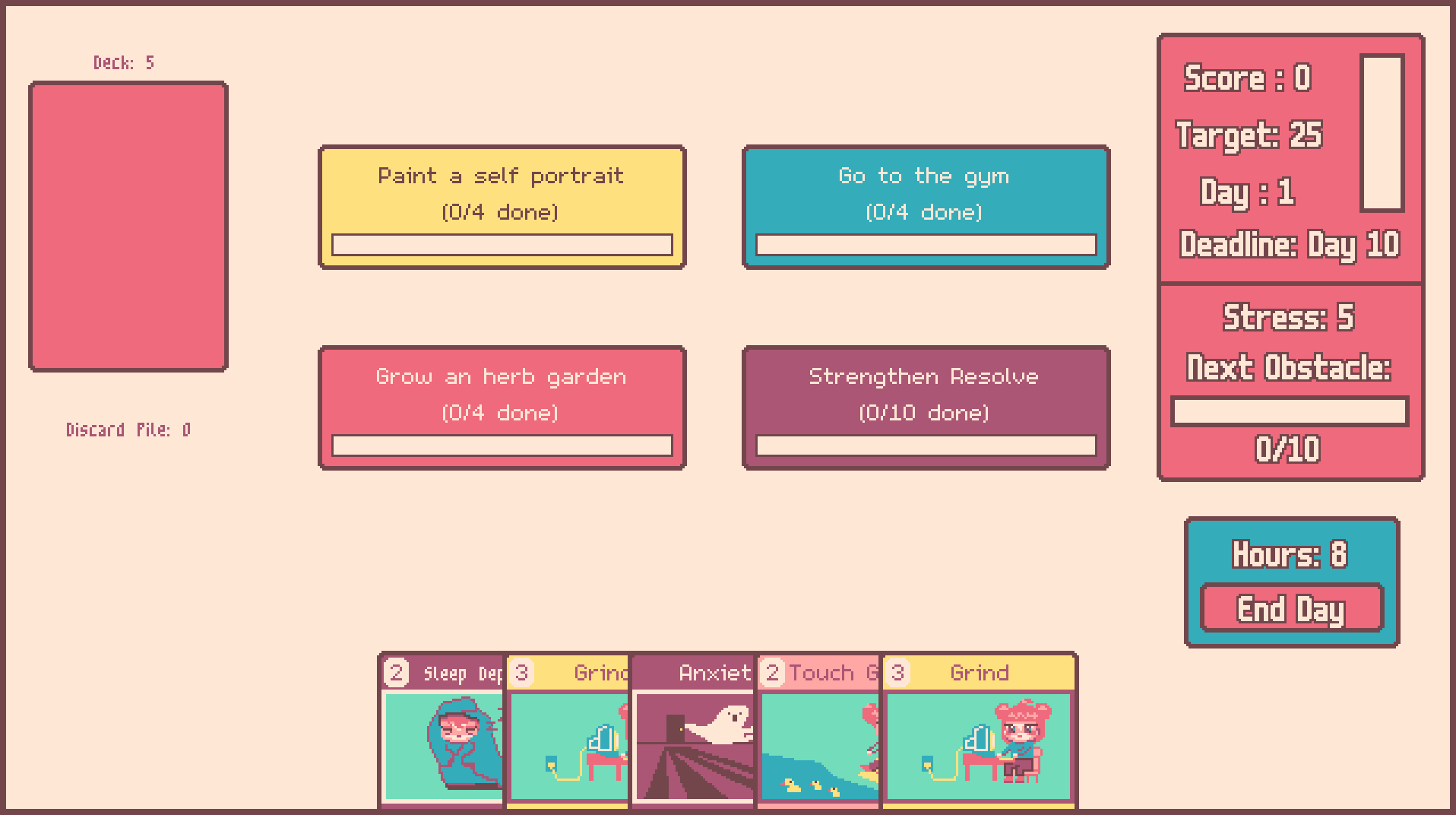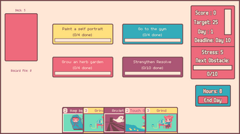 Ruby's Resolve is a cozy game about managing stress and building resolve. Build your deck to combat life's obstacles and finish projects on time.